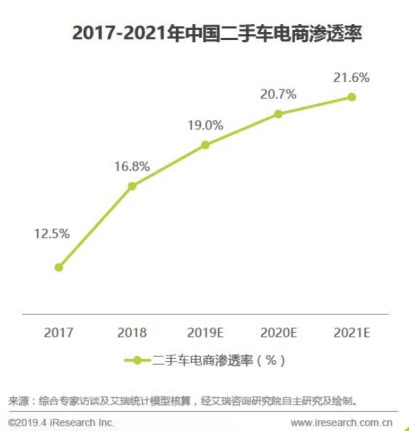 与此同时,中国二手车电商行业经历了快速发展,二手车交易量和交易额进一步增长,渗透率也显著提高。据艾瑞研究显示,2018年中国二手车电商渗透率约为19%;未来三年二手车电商交易量将保持25%左右年复合增速,行业渗透率在2021年将达到21.6%。多方利好消息也让投资人看到了这一行业的市场潜力。