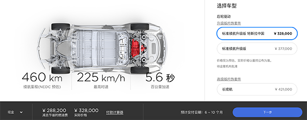 5月31日,特斯拉宣布,将在中国上海超级工厂生产Model 3标准续航升级版车型,并正式开放车辆预订。即日起,消费者可以登录特斯拉中国官网或前往特斯拉直营体验中心进行咨询或预订。Model 3标准续航升级版(特斯拉中国)续航里程为460公里(NEDC预估),起售价为人民币328,000元,预计交付时间为6至10个月。