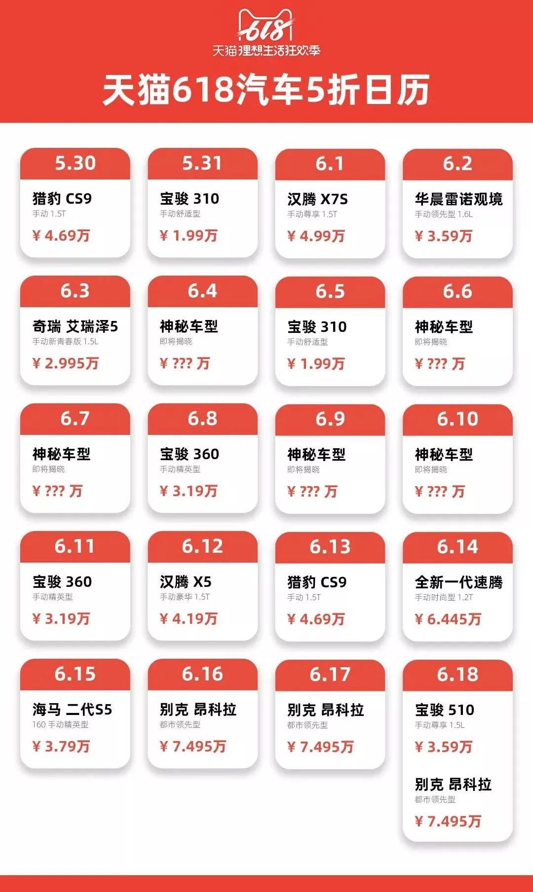日前,天猫推出了“618汽车5折日历”,即从5月30日10点起,天猫每天推出半价车秒杀,覆盖别克、大众、宝骏等汽车品牌,最低1.99万元就可购买汽车。