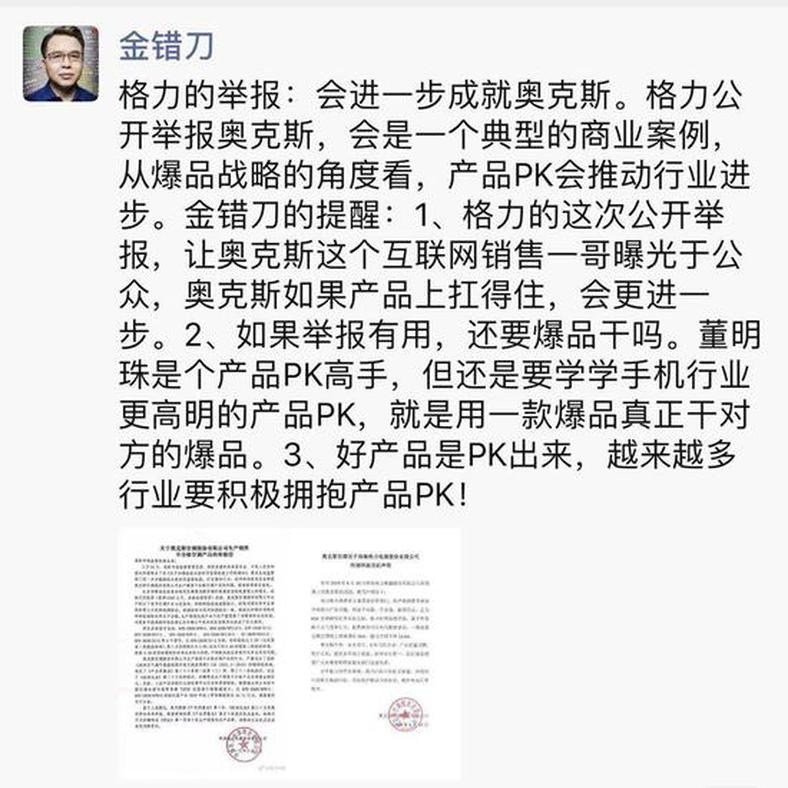 对此,知名媒体人金错刀表示:格力的举报:会进一步成就奥克斯。格力公开举报奥克斯,会是一个典型的商业案例,从爆品战略的角度看,产品PK会推动行业进步。金错刀的提醒:1、格力的这次公开举报,让奥克斯这个互联网销售一哥曝光于公众,奥克斯如果产品上扛得住,会更进一步。2、如果举报有用,还要爆品干吗。董明珠是个产品PK高手,但还是要学学手机行业更高明的产品PK,就是用一款爆品真正干对方的爆品。3、好产品是PK出来,越来越多行业要积极拥抱产品PK!
