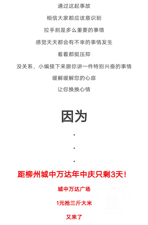 该文前半段内容为当天的一则新闻:一辆婴儿车被后溜汽车碾压,坐在婴儿车上的孩子不幸身亡。后半段则为柳州万达年中庆造势:“通过这起事手刹是多么重要的事情,看着都挺压抑的。没关系,小编接下来跟你讲一件特别兴奋的事情,缓解缓解您的心扉,让您换换心情,因为距柳州万达年中庆只剩3天!城中万达广场1元抢3斤大米又来了……”