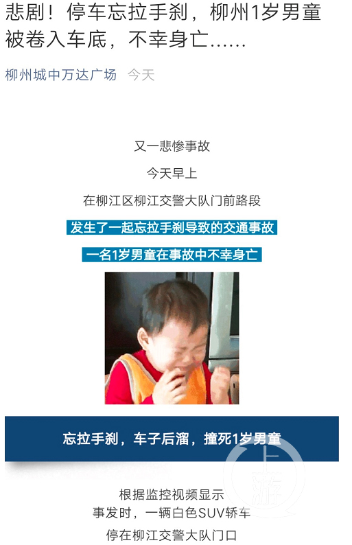 6月11日,柳州城中万达广场官方微信公众号发布《悲剧!停车忘拉手刹,柳州1岁男童被卷入车底,不幸身亡……》一文,引发社会热议。