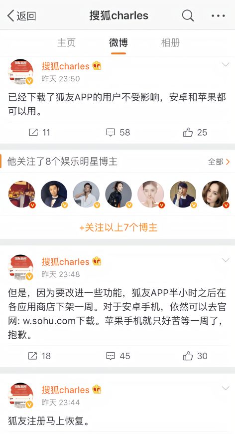 6月11日深夜,张朝阳通过狐友和微博宣布:“因为狐友重要产品功能需要改进,6月12日零点,狐友App将从各应用商店下架一周。当然,新用户安卓手机仍然可以去官网下载。”此后,他还连发多条动态,向网友“安利”官网下载的流程。6月12日,张朝阳则继续正常在狐友记录自己的日常。