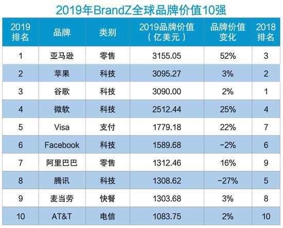 6月11日,全球最大传播服务集团WPP联合品牌资产研究机构凯度共同发布了《2019年BrandZ最具价值全球品牌100强》,亚马逊取代谷歌成为2019年度全球最有价值的品牌。
