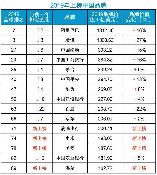 滴滴、小米、美团、海尔都是今年新上榜的中国品牌,而中国品牌的数量也由去年的14个增长到了15个。