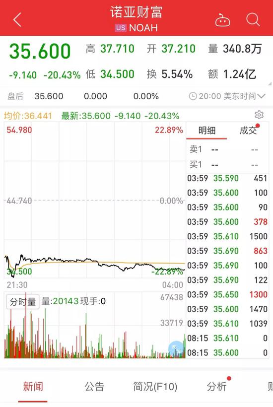 受此影响,诺亚财富股价开盘后大跌,收盘下跌20.43%,报35.60美元。