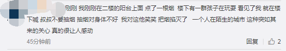 一位在外漂泊的将自己刚刚的体验写了在微博留言:“就在刚刚,我刚刚在二楼的阳台上面点了一根烟,楼下有一群孩子在玩耍,看见了我,就在楼下喊,叔叔不要抽烟,抽烟对身体不好,我对着他笑笑把烟掐灭了。一个人在陌生的城市 这种突如其来的关心,真的很让人感动 !”