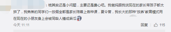 也有网友表示,钱其实是小问题,最主要还是费心吧。我们小时候那种“放养”教育模式用在现在小朋友身上已经不适用了。