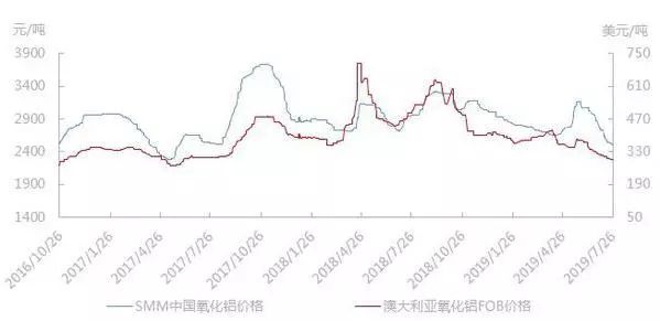 国内自5月27日,氧化铝从均价3163元/吨高位跌至7月26日2517元/吨,跌幅高达20%,市场所料未及。海外澳洲氧化铝FOB价格自5月21日383美元/吨开始震荡偏弱,下行至7月26日298美元/吨,仍有续跌可能。