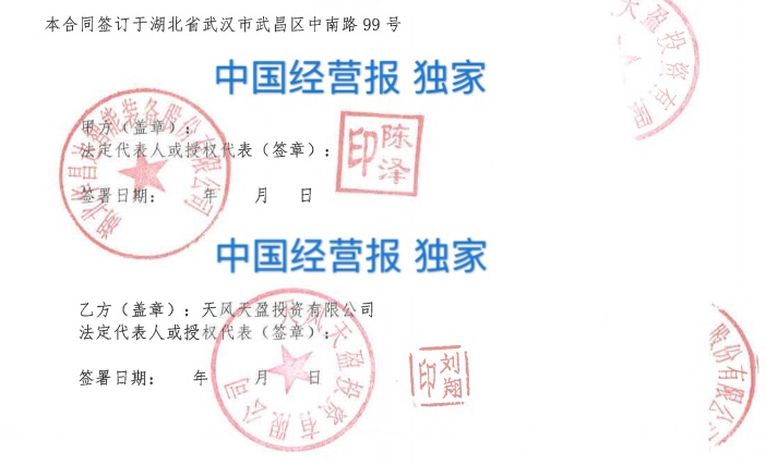 本报记者掌握的证据显示,上述《咨询服务协议》签订于湖北省武汉市武昌区中南路99号,即国创资本当时的办公场所保利广场A座48楼所在地。该份协议除盖有两家公司公章外,还分别盖有公司法定代表人或授权代表陈泽及刘翔的印章,不过并未写明协议所签署的具体日期。截至发稿时,本报记者尚无法核实上述文件中所加盖华昌华公章及法定代表人陈泽印章的真实性。