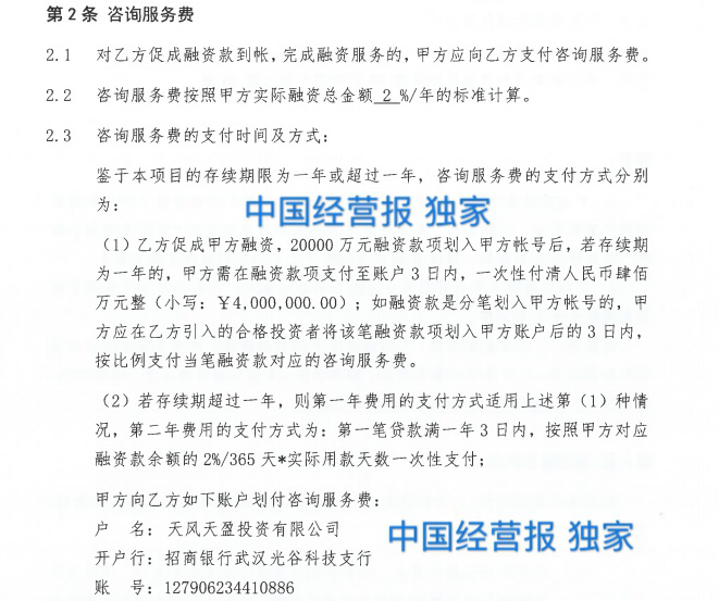 “上述2亿元融资款一经划入华昌达账户,即视为天沣天盈已完成融资的咨询服务。”协议约定,天沣天盈促成融资款到账,完成融资任务后,华昌达需向天沣天盈按实际融资金额的2%支付咨询服务费。咨询服务费的支付方式包括:2亿元融资款项划入华昌达账户后,若存续期为一年,华昌达需在融资款项支付至账户3日内一次性付清400万元;如融资款分笔划入华昌达账户,华昌达需按比例支付当笔融资款对应的咨询服务费。