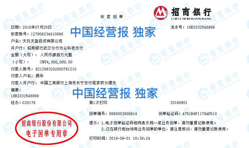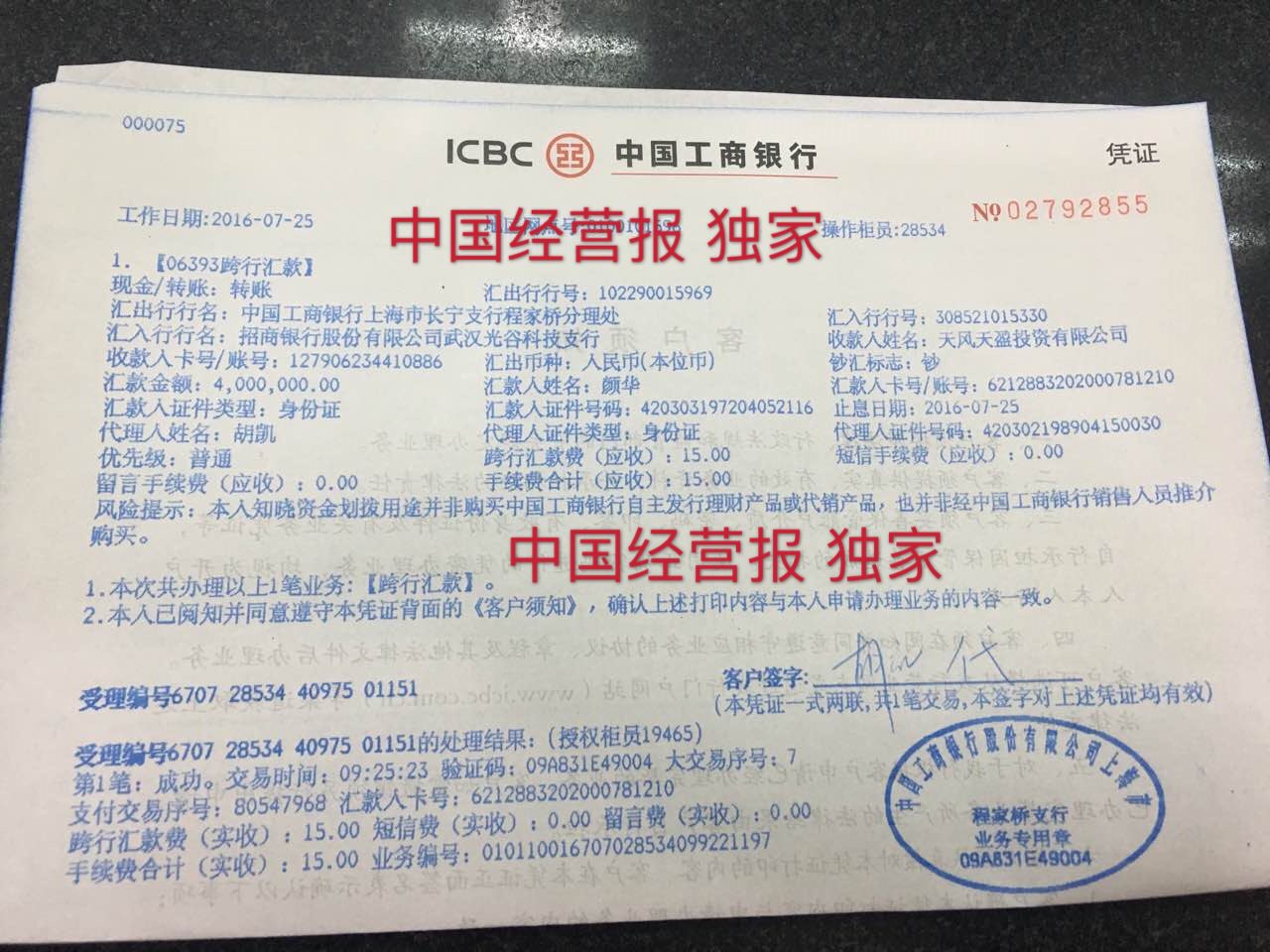 颜华银行转款记录显示,2016年7月25日,颜华通过工商银行将费用转入天风天盈投资有限公司(以下简称“天风天盈”)银行账户,代理人为胡凯。天沣天盈收款回单显示,公司于当天收到了该笔费用,付款人账号及姓名显示为颜华。
