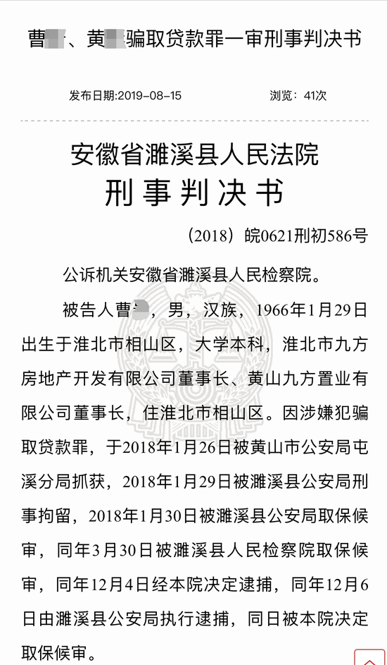 裁判文书显示,曹某,男,汉族,1966年1月出生于淮北市相山区,大学本科,为淮北市九方房地产开发有限公司董事长、黄山九方置业有限公司董事长;黄某,男,汉族,1969年4月出生于淮北市相山区,大专文化,为淮北市九方房地产开发有限公司会计、淮北市广宇景观装饰工程有限公司总经理。
