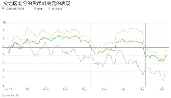 在追踪的41中货币中,2019年只有9种货币兑美元升值。欧元(1.1013,0.0004, 0.04%)兑美元上周跌至两年以来新低,英镑(1.2328, 0.0002,0.02%)兑美元跌至上世纪80年代以来的最低点。哥伦比亚比索等一些新兴市场货币兑美元汇率也已经跌至历史最低水平,阿根廷比索是其中跌得最惨的货币之一,在8月份暴跌后,阿根廷最近出台了资本管制。