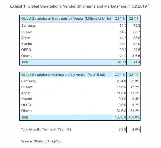 根据市场调查机构 Strategy Analytics 的最新报告显示,2019 年第二季度,华为手机在全球智能机市场份额达到了 17.2%,位列第二位,其后为苹果,市场份额 11.1%。