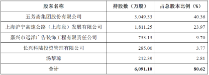 目前,公司的控股股东为五芳斋集团,直接和间接合计持有公司3,782.4532万股股份,占公司总股本50.06%,其中直接持有40.36%的股份,通过全资子公司嘉兴市远洋广告装饰工程有限责任公司间接持有9.70%。而五芳斋集团的实际控制人为厉建平、厉昊嘉父子二人,双方合计持有五芳斋集团40%股份,所以他们也是五芳斋实业的实际控制人。