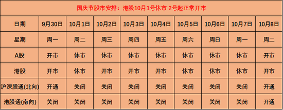 港股通(南向买港股)将于9月27日(周四)暂停至10月7日,于10月8日(周二)重开。沪、深股通(北向买A 股)将于10月1日(周二)暂停至10月7日,也于10月8日重开。