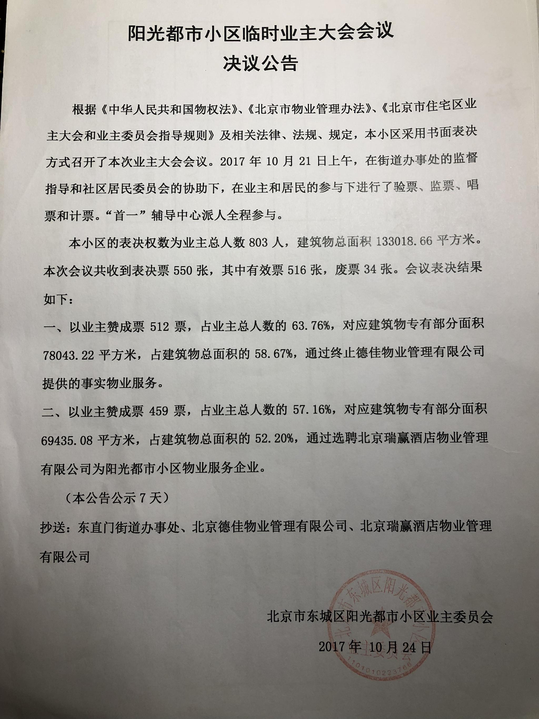 时间回溯到2017年10月21日。当日,阳光都市小区临时业主大会召开,以业主赞成票512票(占业主总人数63.76%),通过终止德佳物业提供的物业服务;以业主赞成票459票(占业主总人数57.16%),通过选聘北京瑞赢酒店物业管理有限公司(简称“瑞赢物业”)为小区物业服务企业。这份决定于2017年10月24日对外发布。