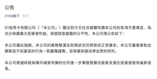 同时,51信用卡发布公告称,“公司的业务营运即财务状况仍然保持正常健全。”但公告并未就公司被警方调查一事作出说明。