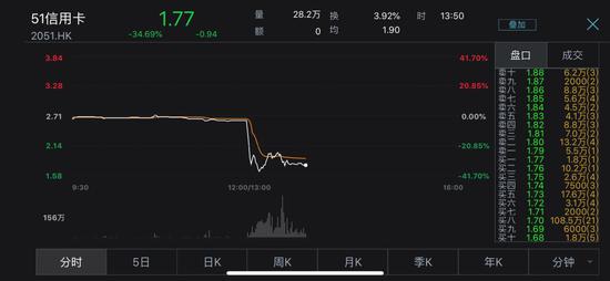这一消息在午间发酵,下午港股开盘后,51信用卡(2051.HK)股价“闪崩”,盘中一度暴跌超40%。随后,51信用卡宣布停牌,停牌前跌幅收窄至34.69%。