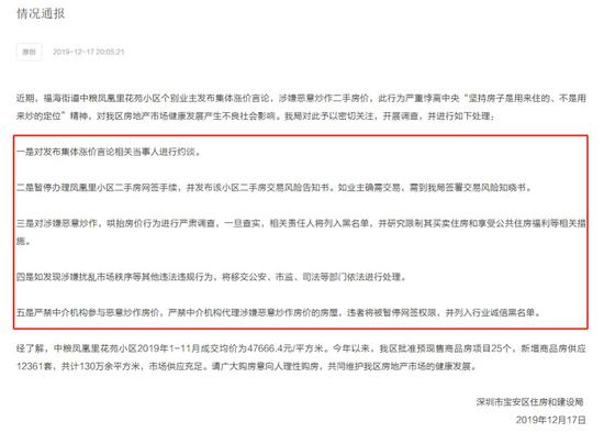 12月17日晚间,深圳市宝安区住房和建设局(简称“宝安住建局”)发布通报称,近期福海街道中粮凤凰里花苑小区个别业主发布集体涨价言论,涉嫌恶意炒作二手房价。