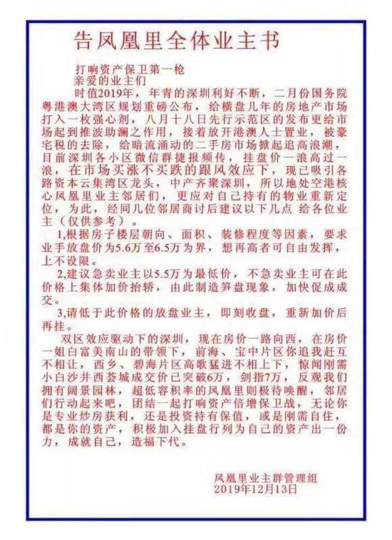 4年每平米涨了1.5万元!可能是觉得涨价速度太慢了,该小区业主于今年12月13日在业主群里发了一封《告凤凰里全体业主书》,表示要“打响资产保卫第一枪”,号召业主将放盘价调至每平米5.6万元至6.5万元。并呼吁“请低于此价格的放盘业主,即刻收盘,重新加价后再挂”。