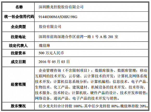 公告显示,腾龙控股成立于2016年5月3日,注册资本500万元,法定代表人魏佳琳,任少龙持股80%,魏佳琳持股20%,任少龙和魏佳琳为夫妻。
