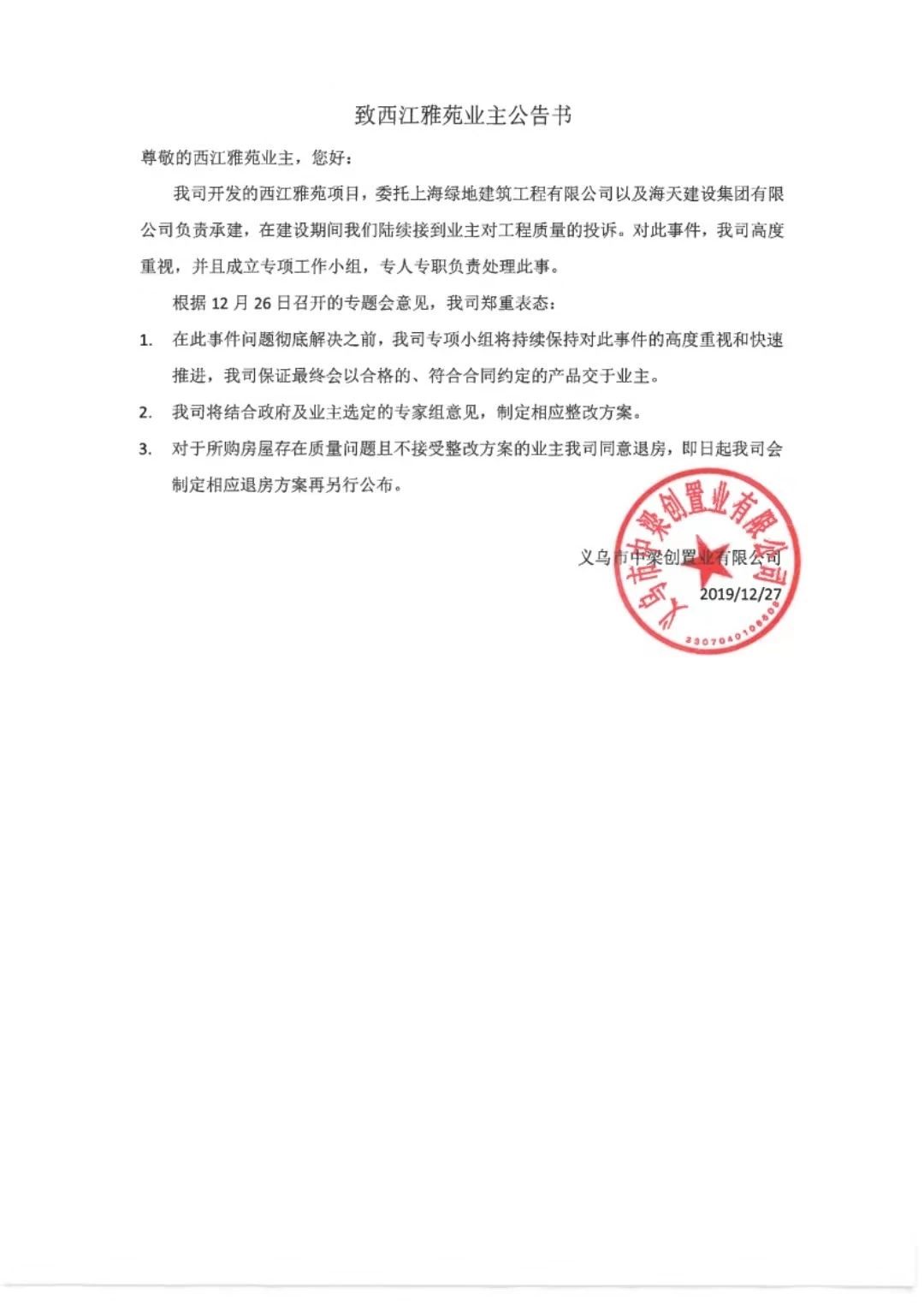 12月28日,微信认证账号主体为义乌市中梁创置业有限公司的公众号“金地中梁西江雅苑”发布一份《告西江雅苑全体业主》公告,明确同意对房屋存在问题且不接受整改方案的业主退房。
