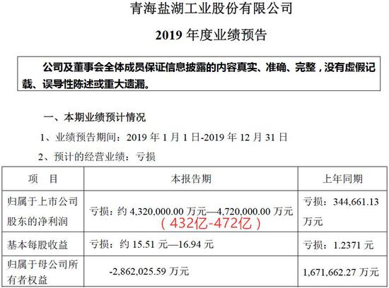 昨天,周六,晚上,A股上市公司*ST盐湖(8.580, -0.17, -1.94%)发布公告,预计2019年将亏损432亿元-472亿元!本文标题中的432亿元还不是最悲观的预估数!