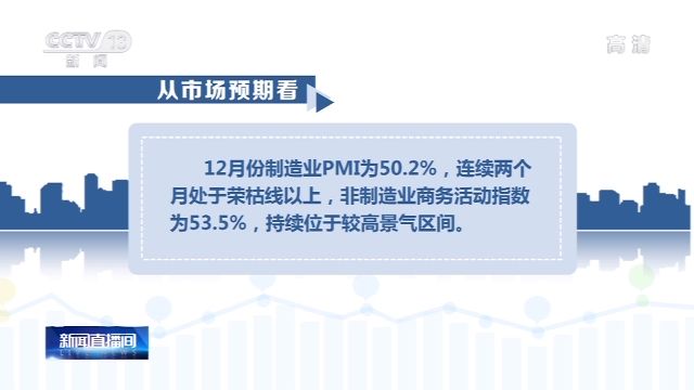 从市场预期看,12月份制造业PMI为50.2%,连续两个月处于荣枯线以上,非制造业商务活动指数为53.5%,持续位于较高景气区间。