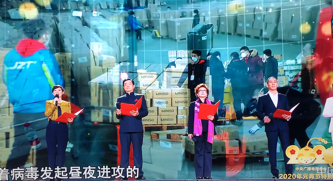 2月8日央视元宵晚会,名创优品支援武汉物资的画面出现在抗击肺炎节目中 |