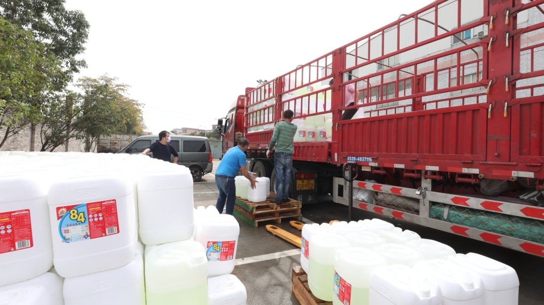 名创优品第二批捐赠物资包含20公斤装84消毒液共2640桶