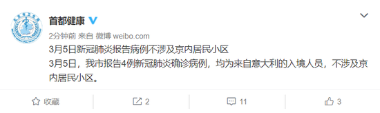 3月5日,我市报告4例新冠肺炎确诊病例,均为来自意大利的入境人员,不涉及京内居民小区。
