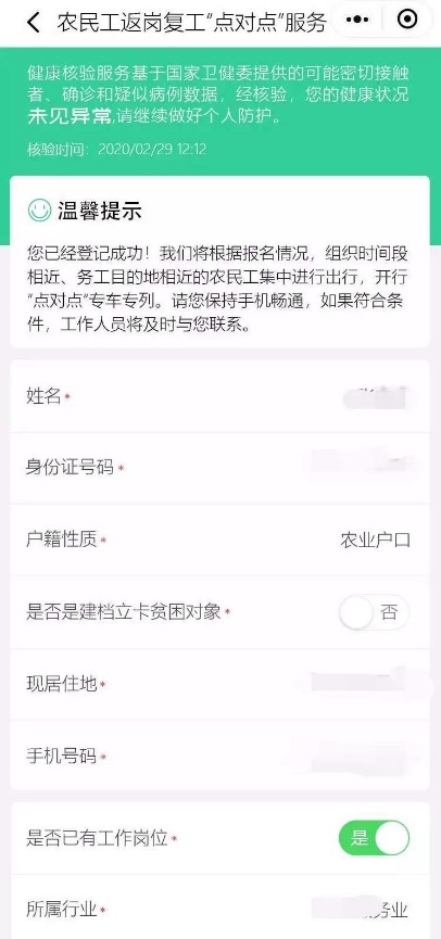 目前,“农民工返岗复工点对点服务”微信小程序已经正式上线,腾讯云、山大地纬为其提供技术支持。在操作流程上,有返岗意向的农名工微信搜索“农民工返岗复工点对点服务”即可进入小程序。进入小程序或返岗复工页面,阅读“点对点”服务说明后,农民工即可录入自己的个人信息,以及返工需求。人社部门随后将联系符合条件的农民工,组织集中返岗出行。