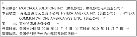 上述商业秘密及版权侵权诉讼案件于美国当地时间 2019 年 11 月 6 日(北京时间2019年 11 月 7 日)进入庭审阶段。美国当地时间 2020 年 2 月 12 日,摩托罗拉在庭审中最终明确其主张公司部分DMR产品侵犯摩托罗拉21项商业秘密及4项美国版权,要求公司、美国公司及美西公司就侵犯其商业秘密及版权行为支付相应赔偿。