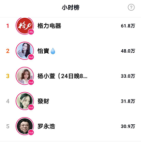 在直播开始不久时,@格力电器 一度位于第一名,而当时@罗永浩位于第五名。在直播快结束时,罗永浩的打赏数据冲上了第一名,董明珠所使用的账号@格力电器也掉落至第三名。