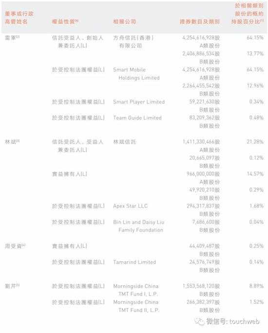 截至2019年12月31日,雷军持有4,254,616,928股A类股,占A类股的比例为64.15%,持有2,406,886,534股B类股,占B类股总数的13.77%。