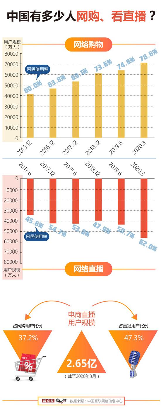 据中国互联网络信息中心近日发布的第45次中国互联网络发展状况统计报告,截至2020年3月,电商直播用户规模达2.65亿,占网购用户的37.2%,占直播用户的47.3%。