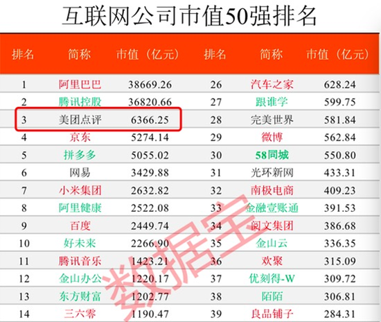 5月17日,数据宝发布的互联网公司市值50强榜单中,美团点评便排名第三,当时美团点评的市值仅有6366.25亿。现在,万亿市值的美团已经把京东、拼多多等互联网企业远远甩在身后。