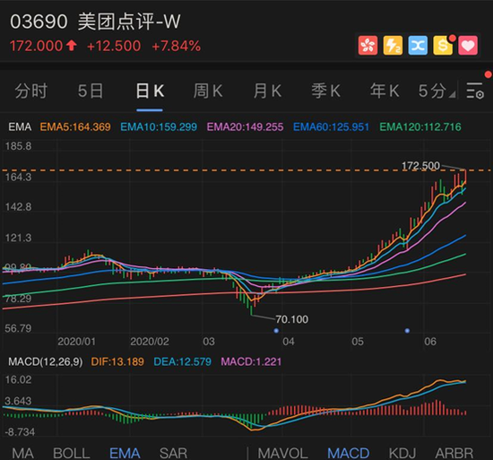 而随着国内的疫情得到控制,美团的股价逐渐回升。截至今日收盘,美团的股价已从70.1港元的低点上涨了146%,在短短三个月内实现股价翻倍。