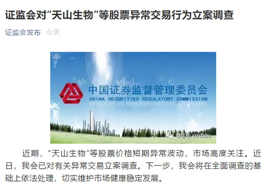 突发!证监会出手,对天山生物(34.660, 0.00, 0.00%)(维权)等异常交易立案调查!公司最新回应来了...疯狂“妖股”该熄火了?