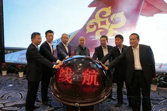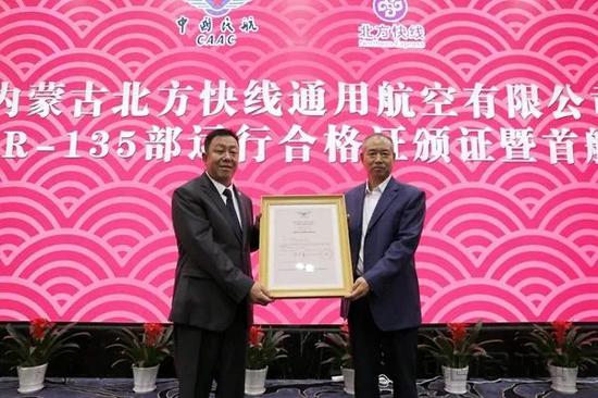 在首航仪式上,民航内蒙古监管局党委书记、局长周建国向北方快线航空总经理卢君颁发了《航空运营人运行合格证》。